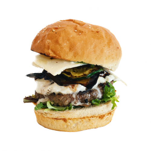 Bun's maison, steak haché 125gr , mozzarella, aubergine & courgettes grillées, salades roquettes, tomates séchées, copeaux de parmesan,
