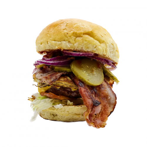 Bun's maison, steak haché 125 gr, cheddar, bacon grilles*, œuf, oignons rouges, cornichons, salade iceberg, tomates, sauce barbecue.