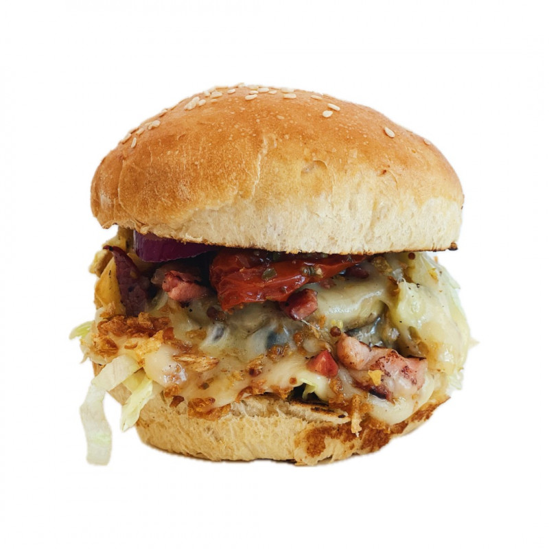 Steak haché 125 gr, raclette, lardons fumé, pommes de terre, oignons rouges, salade iceberg, tomates séchées, oignons fris,